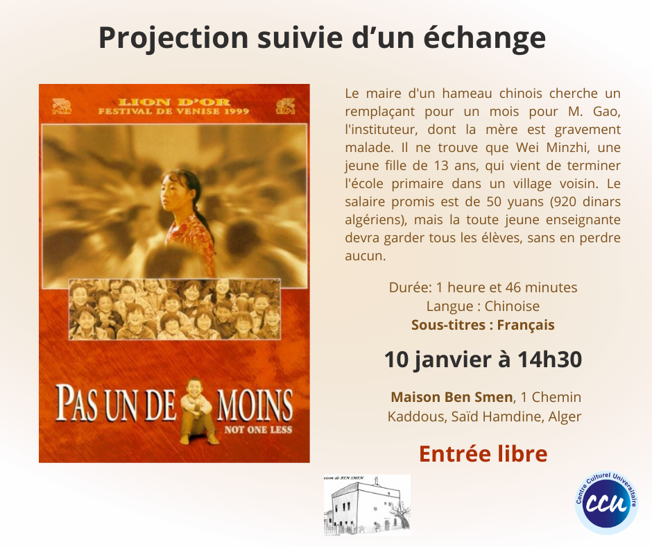 – Samedi 10 janvier : Projection d’un film à 14h30 à Ben Smen, suivie d’un échange. La série des films choisis pour ce « cinéma de la rencontre » (avec des projections alternativement à Ben Smen et au CCU) invite à un parcours, et cette fois-ci il s’agit de la traversée d’une épreuve, par une très jeune enseignante chinoise, très beau.