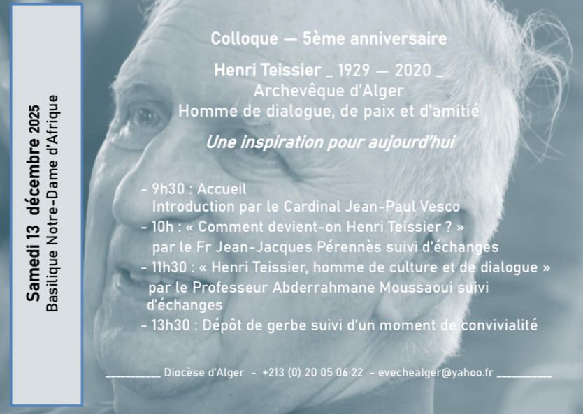 Date13 Déc 2025 Heure 9 h 30 min - 13 h 30 minColloque 5ème anniversaire Henri Tessier 1929-2020 Archevêque d’AlgerPartagez cet événement+ Ajouter à mon Agenda Google+ iCal / Outlook export 00jours 00heures 00minutes 00secondes
