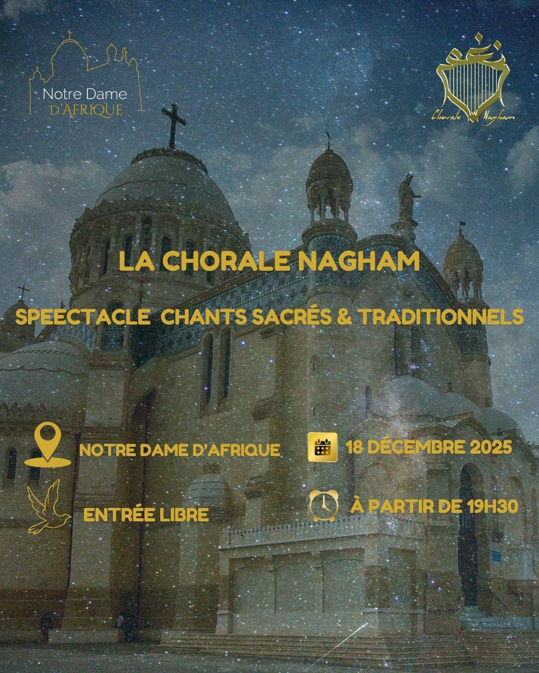 Date18 Déc 2025 Heure 19 h 30 min - 21 h 30 minConcert de Noël à Notre Dame d’Afrique, AlgerConcert de Noël à N.D. d’Afrique, AlgerPartagez cet événement+ Ajouter à mon Agenda Google+ iCal / Outlook export 00jours 00heures 00minutes 00secondes