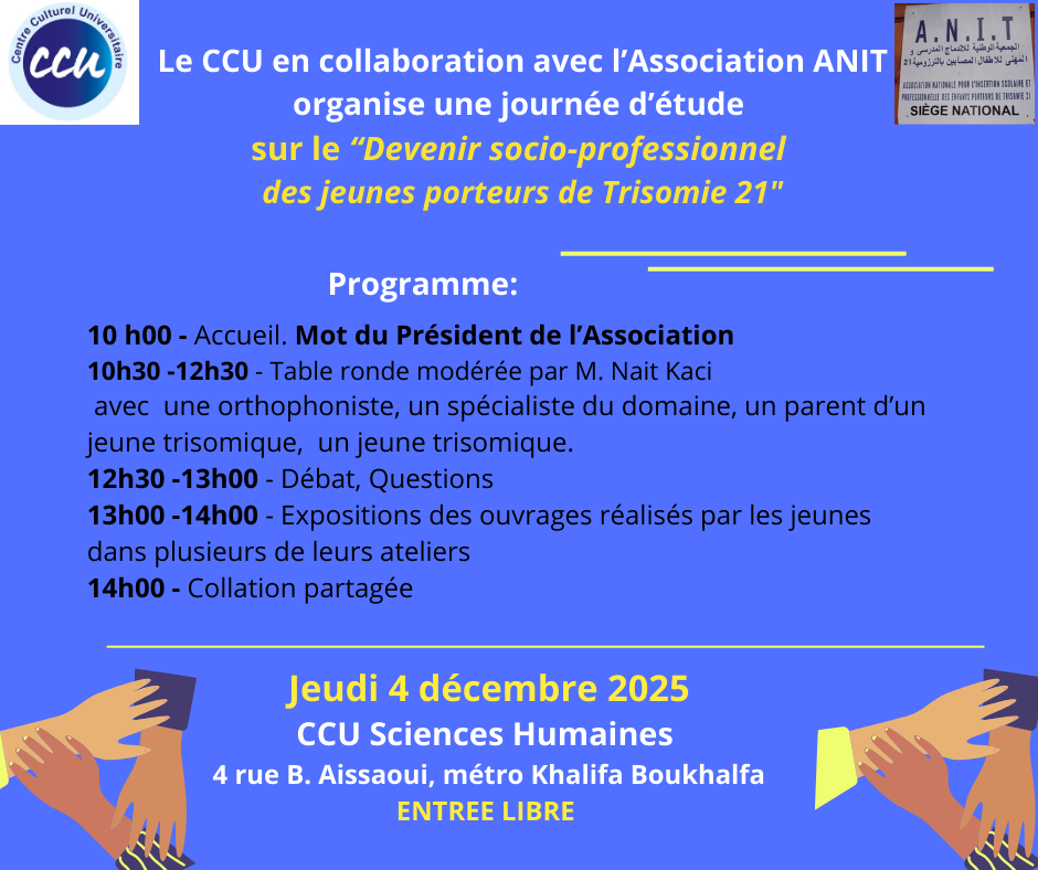 Date04 Déc 2025 Heure 10 h 00 min - 14 h 00 minDevenir socio-professionnel des jeunes porteurs de Trisonomie 21Partagez cet événement+ Ajouter à mon Agenda Google+ iCal / Outlook export 00jours 00heures 00minutes 00secondes