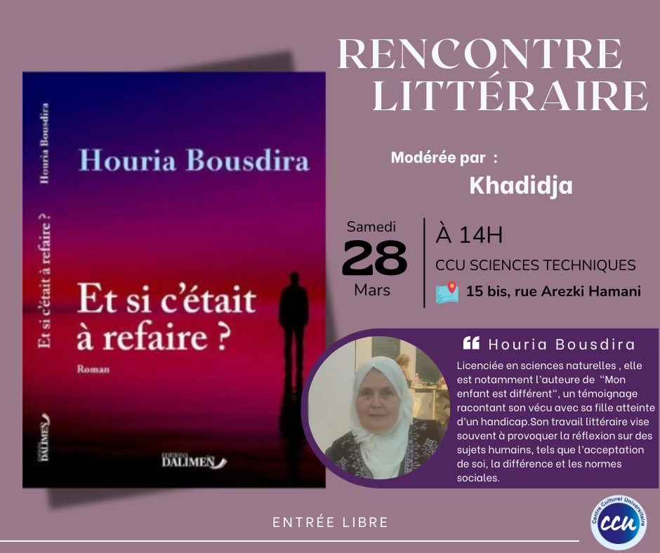 Samedi 28 mars, à 14h00, au CCU Sciences Techniques, (15 bis rue Arezki Hamani, ex Charras. Métro Tafoura).