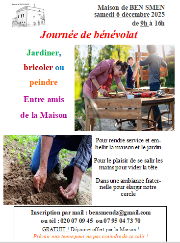 Date06 Déc 2025 Heure 9 h 00 min - 16 h 00 minJournée de bénevolat à Ben Smen AlgerPartagez cet événement+ Ajouter à mon Agenda Google+ iCal / Outlook export 00jours 00heures 00minutes 00secondes