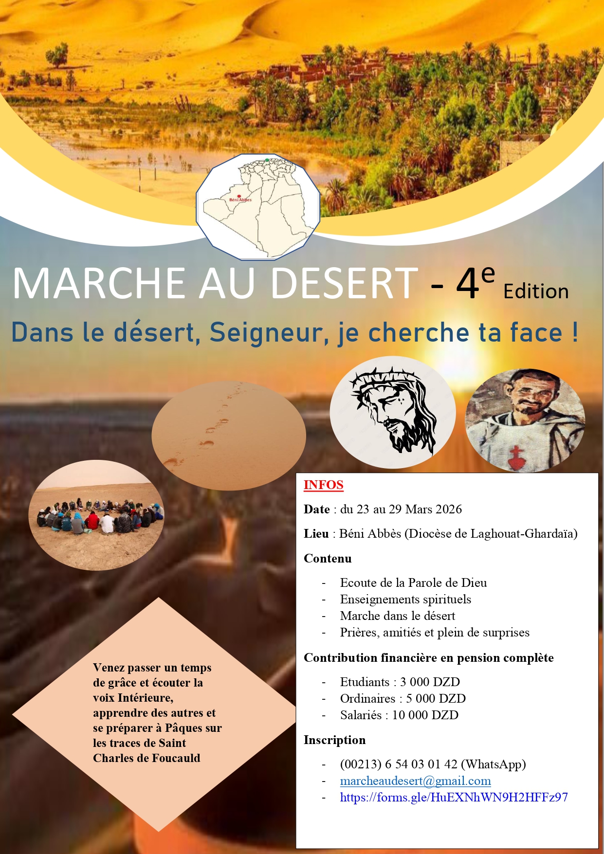 L’équipe de l’organisation de la Marche au désert a le plaisir de vous inviter à la 4e édition de la marche au désert qui aura lieu du 23 au 29 Mars 2026 à Beni Abbès (Diocèse de Laghouat -Ghardaïa). Elle est ouverte à tous ceux qui désirent passer un temps de recueillement, de ressourcement et d’écoute et d’aventures avant la Pâques sur les traces de saint Charles de Foucauld. Les détails sont dans l’affiche. Nous vous invitons à relayer l’information au niveau des aumôneries, communautés, paroisses, cités universitaires etc…..pour la réussite de cette activité de notre Église d’Algérie.