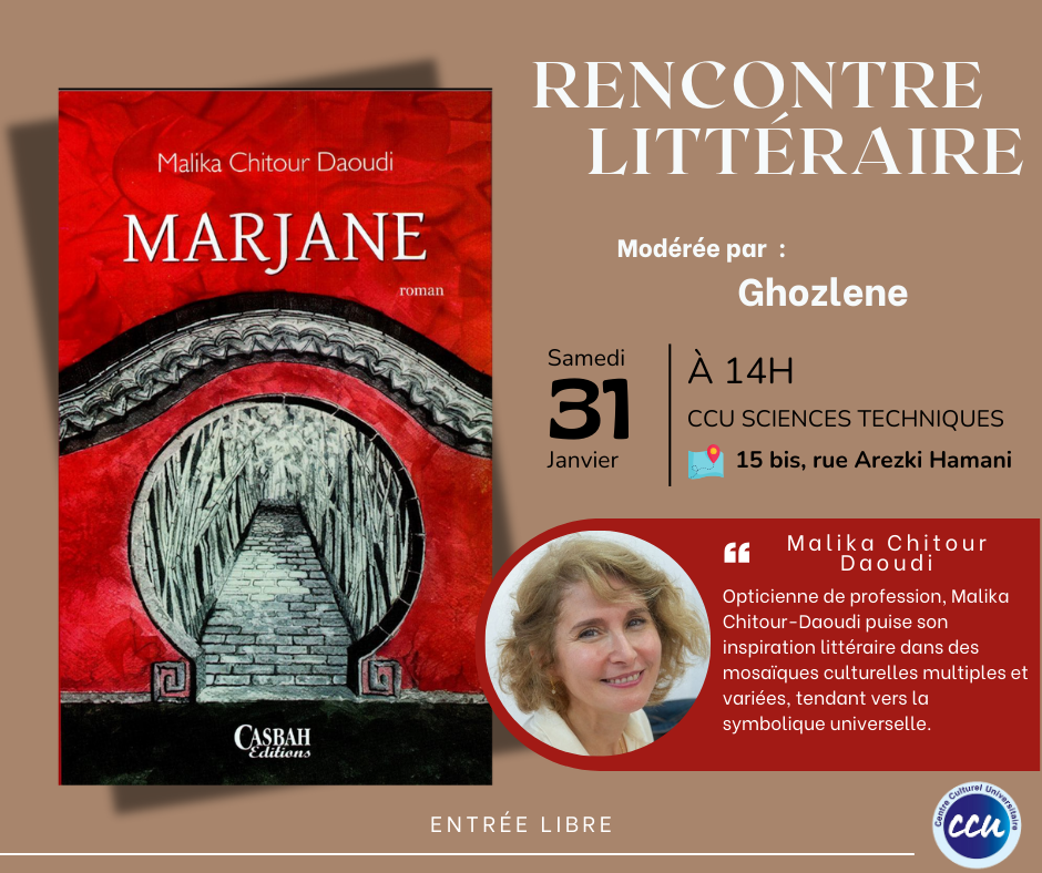 Malika CHITOUR DAOUDI sera présente pour une rencontre autour de son roman : Marjane, Casbah Editions