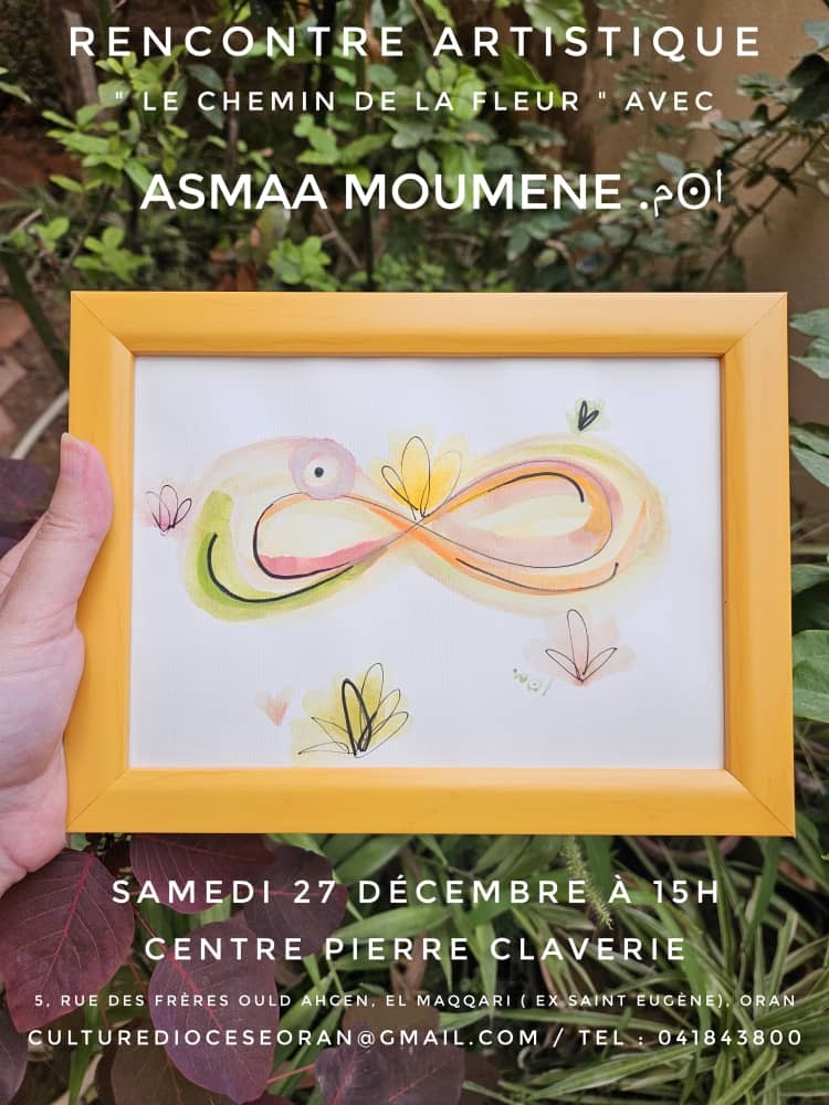 Date27 Déc 2025 Heure 15 h 00 min - 17 h 00 minRencontre artistique avec Asmaa MoumeneLe chemin de la fleure à Oran samedi 27 décembre au Centre Pierre Claverie à 15h00 Partagez cet événement+ Ajouter à mon Agenda Google+ iCal / Outlook export 00jours 00heures 00minutes 00secondes