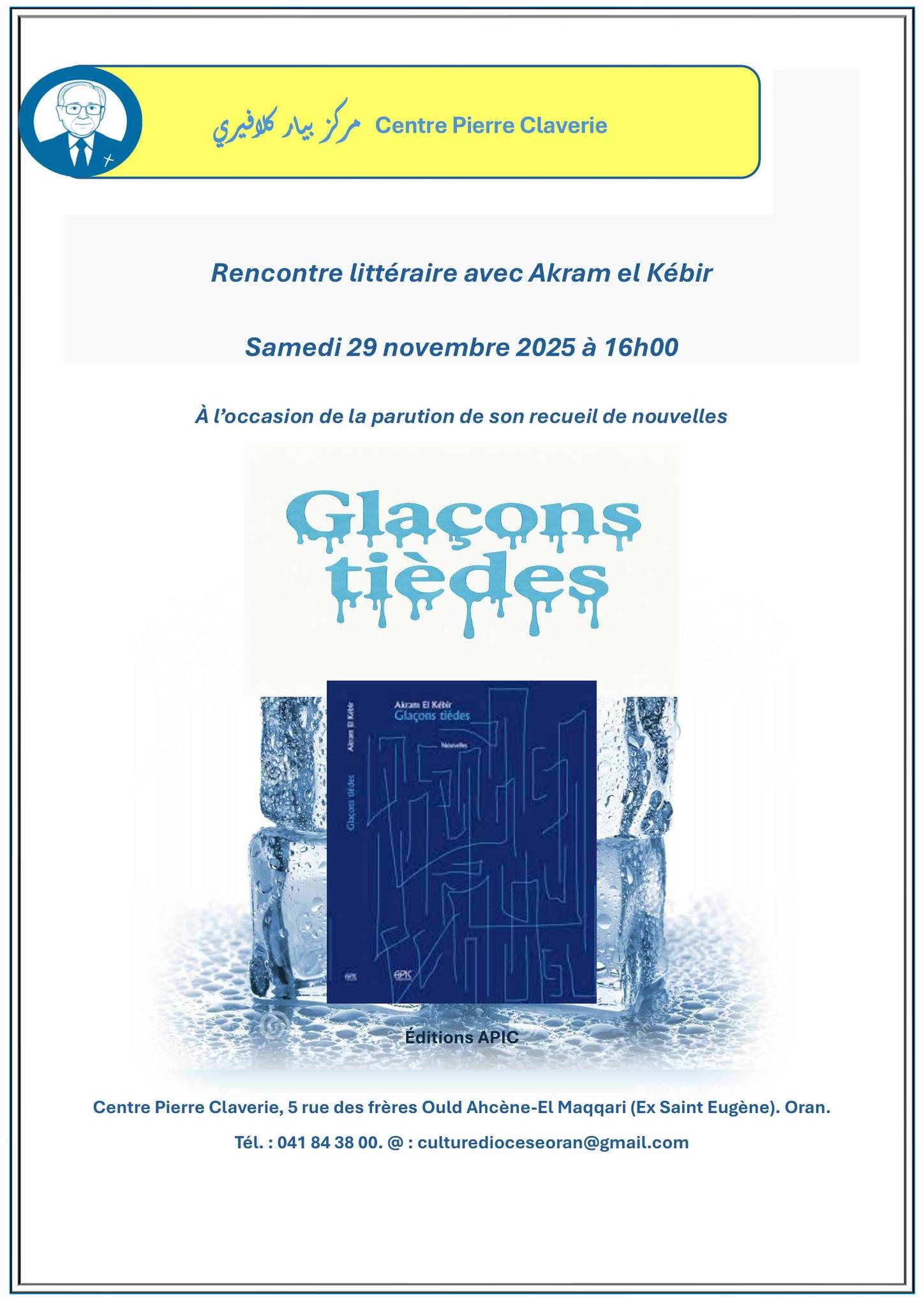 Date29 Nov 2025 Heure 16 h 00 min - 18 h 00 minRencontre littéraire avec Akram el Kébir à OranPartagez cet événement+ Ajouter à mon Agenda Google+ iCal / Outlook export 00jours 00heures 00minutes 00secondes