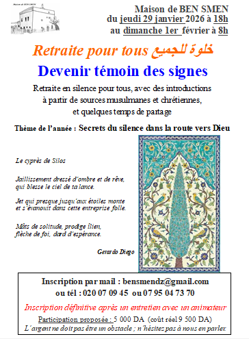Du jeudi 29 janvier soir au dimanche 1er février matin : Retraite Pour Tous (chrétiens et musulmans ensemble), en invitant à progresser vers Dieu par le chemin du silence, pour devenir témoins des signes. On demande un petit entretien, au moins par téléphone, au moment de l’inscription, pour bien préciser la proposition.