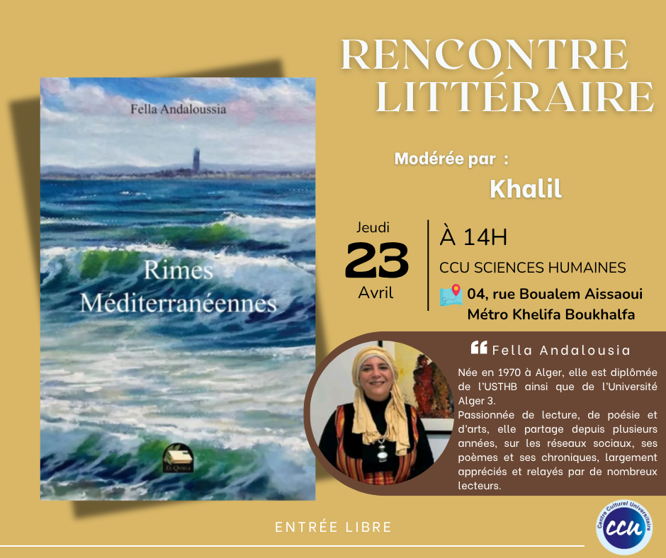 Jeudi 23 avril, à 14h00, au CCU Sciences Humaines (04 rue Boualem Aissaoui, à côté de la Mosquée Rahma. Métro Khelifa Boukhalfa).
