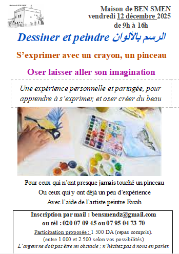 Date12 Déc 2025 Heure 9 h 00 min - 16 h 00 minUne journée de dessin et peinture le vendredi 12 décembre, pour le plaisir du beau !Partagez cet événement+ Ajouter à mon Agenda Google+ iCal / Outlook export 00jours 00heures 00minutes 00secondes