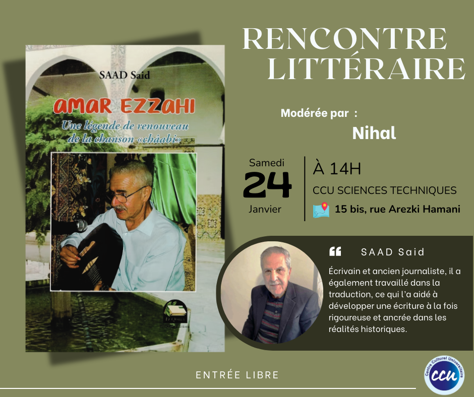 Said SAAD sera présent pour une rencontre autour de la biographie Amar Ezzahi. Une légende du renouveau de la chanson « châabi »