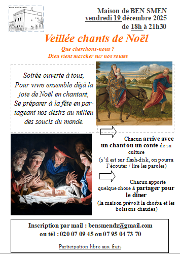 Date19 Déc 2025 Heure 18 h 00 min - 21 h 30 minVeillée chants de NoëlSoirée ouverte à tous pour vivre déjà la joie de Noël en chantantPartagez cet événement+ Ajouter à mon Agenda Google+ iCal / Outlook export 00jours 00heures 00minutes 00secondes